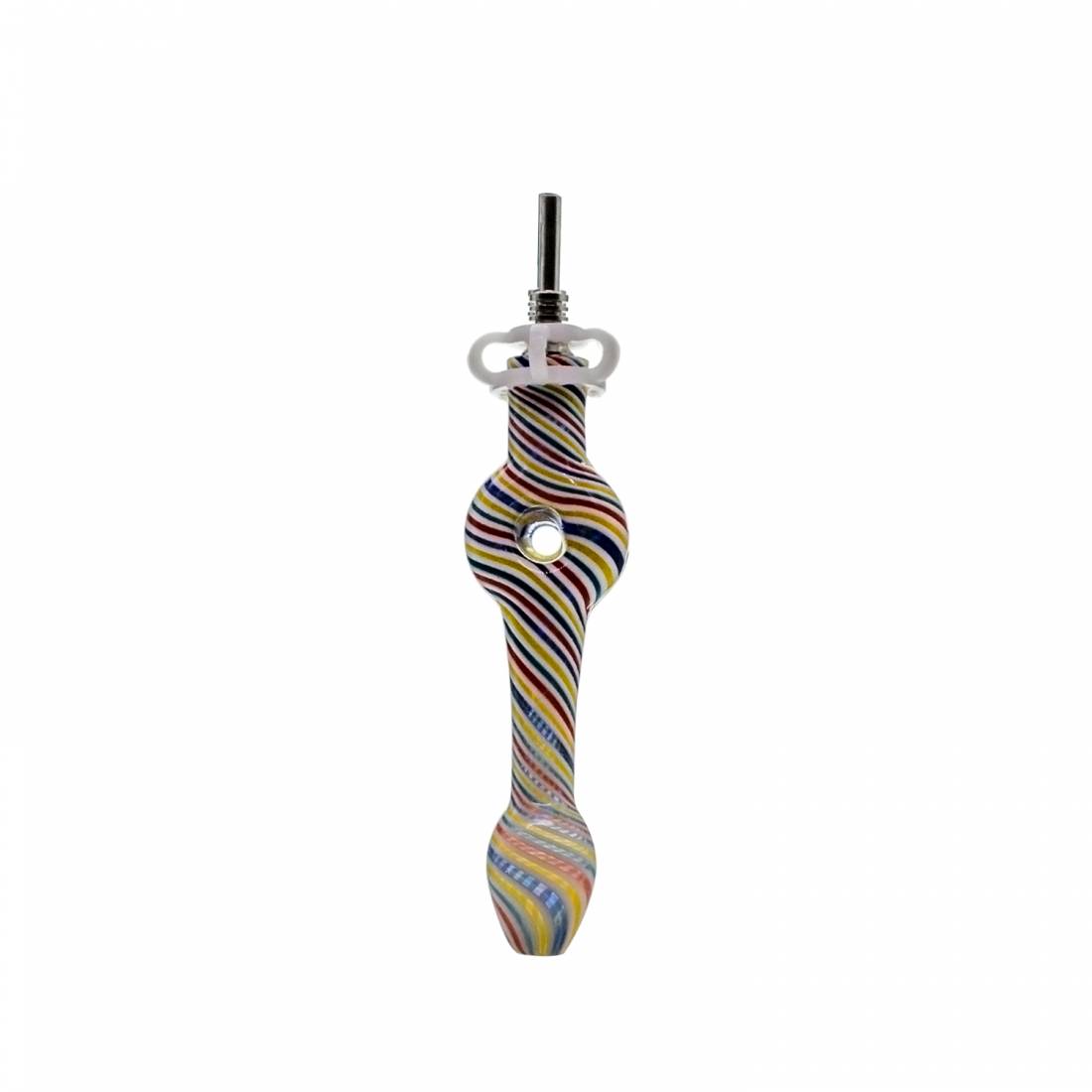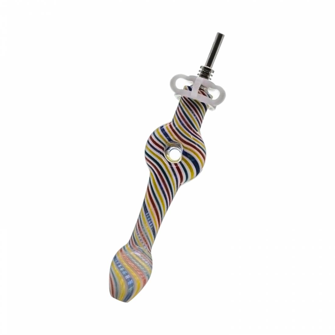 Incluye una punta metálica removible y un recipiente de vidrio para apoyar el concentrado, ideal para mantener la preparación más ordenada y evitar trabajar directo sobre la mesa. Es una opción simple y funcional para quienes buscan un nectar collector mini para su rutina con dabs.